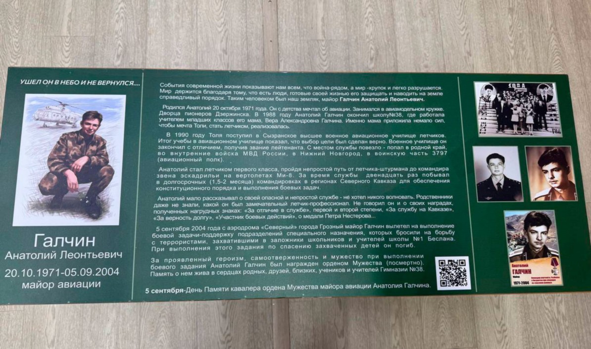 20 октября 2025 года в МБОУ «Гимназия №38» состоялась торжественная церемония открытия «Парты Героя», посвященная выпускнику нашей Гимназии Галчину Анатолию Леонтьевичу, погибшему при исполнении воинского долга в Чеченской республике.